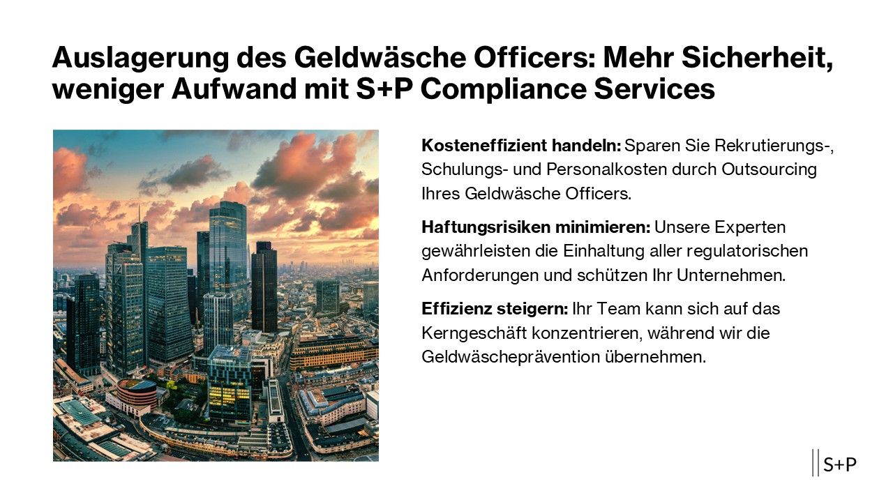 S+P Compliance Services ermöglicht es Unternehmen, ihren Geldwäsche Officer auszulagern und so Kosten zu sparen. Wir übernehmen die komplette Verantwortung für Ihre Compliance-Aktivitäten und sorgen dafür, dass Sie mit allen gesetzlichen Anforderungen in Einklang bleiben.